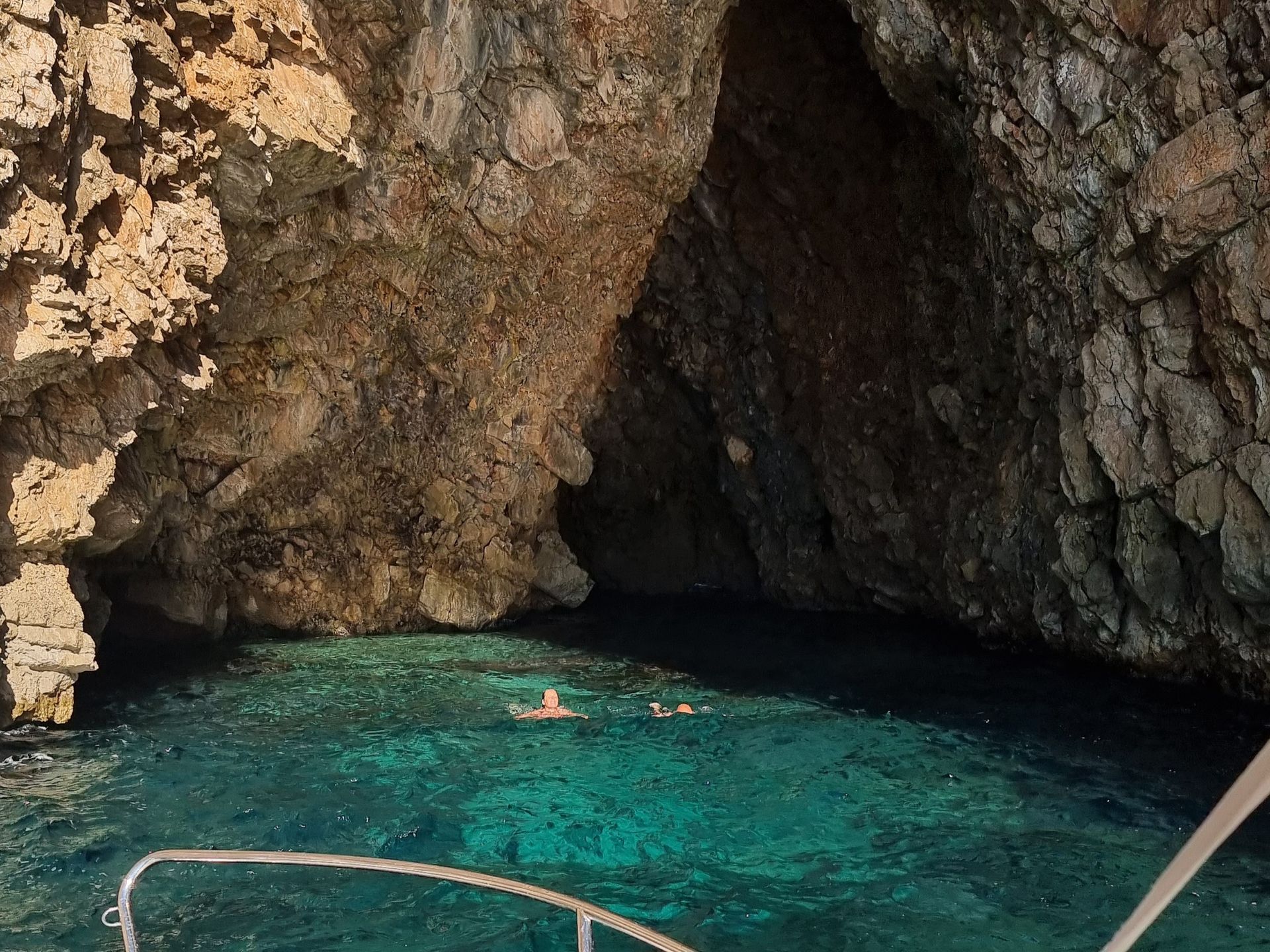 • After Mamula Prison our last attraction is a Blue Cave. It is a natural sea cave which is known for its unique blue light effect, which is created by sunlight reflecting off the white sandy bottom of the cave and through the crystal clear water. Visitors can only access the cave by boat, and it is a popular destination for tourists and boating enthusiasts. The cave is big, with a narrow entrance that opens up into a larger chamber. Inside, the water is a deep blue color, and the cave walls are smooth and shiny. The Blue Cave is a beautiful and awe-inspiring natural wonder. We will stop here for 40/50min so you can take a swim, relax and enjoy a magic of this place.